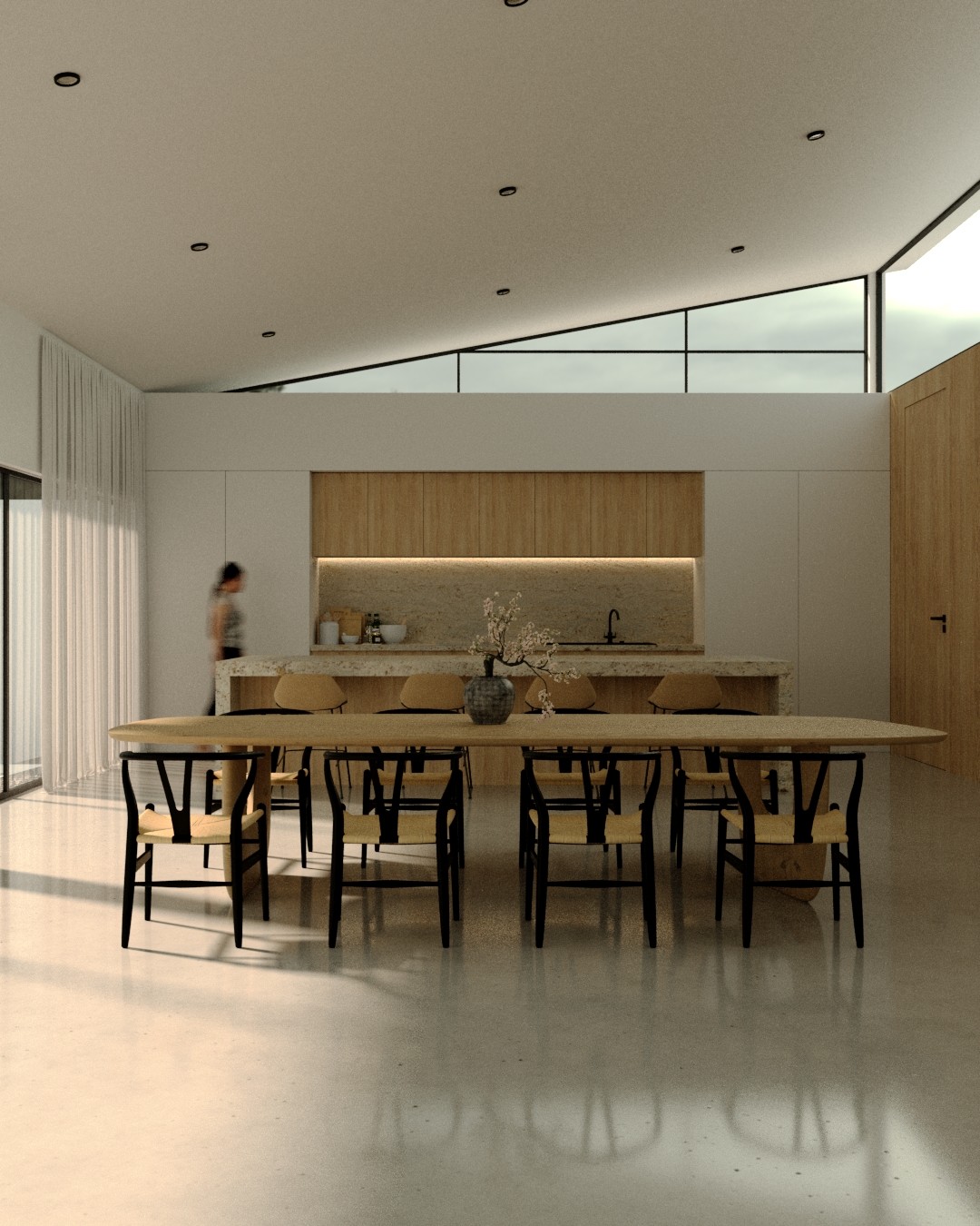Esta residencia de una planta está inspirada en el estilo Japandi contemporáneo, destacando por su diseño sereno, líneas limpias, materiales puros y una atmósfera profundamente contemplativa.
