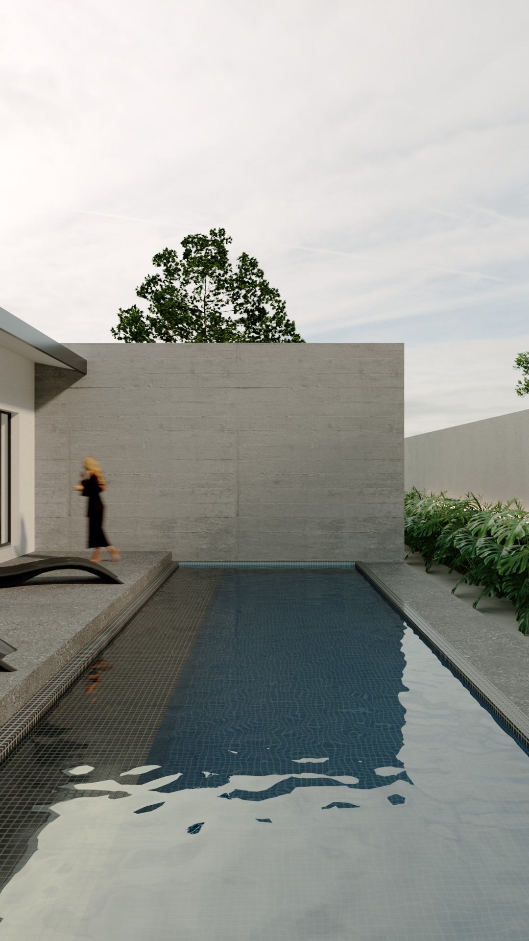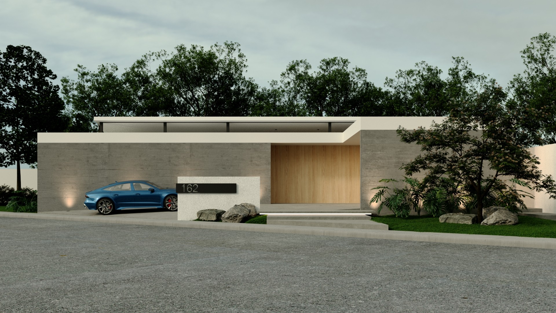 Su fachada se compone de volúmenes geométricos horizontales que alargan visualmente la perspectiva. El uso del concreto aparente como material predominante proyecta fuerza y sobriedad, mientras que el acceso principal se jerarquiza con un marco de madera cálida que suaviza la composición y brinda una bienvenida elegante. El paisajismo refuerza la estética del proyecto mediante una combinación de vegetación natural y elementos pétreos que enmarcan el acceso y lo acompañan con un gesto sutil pero intencional.