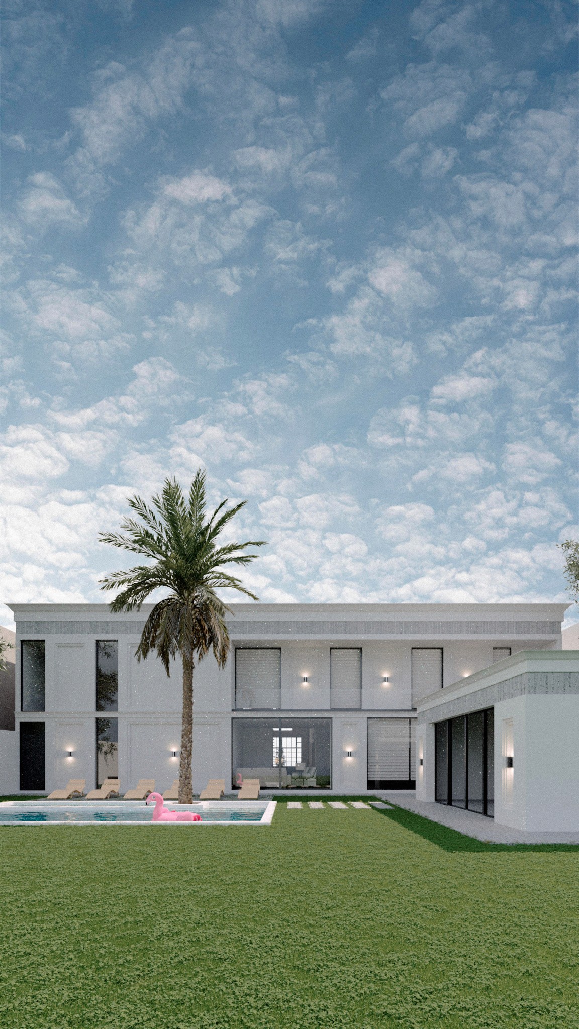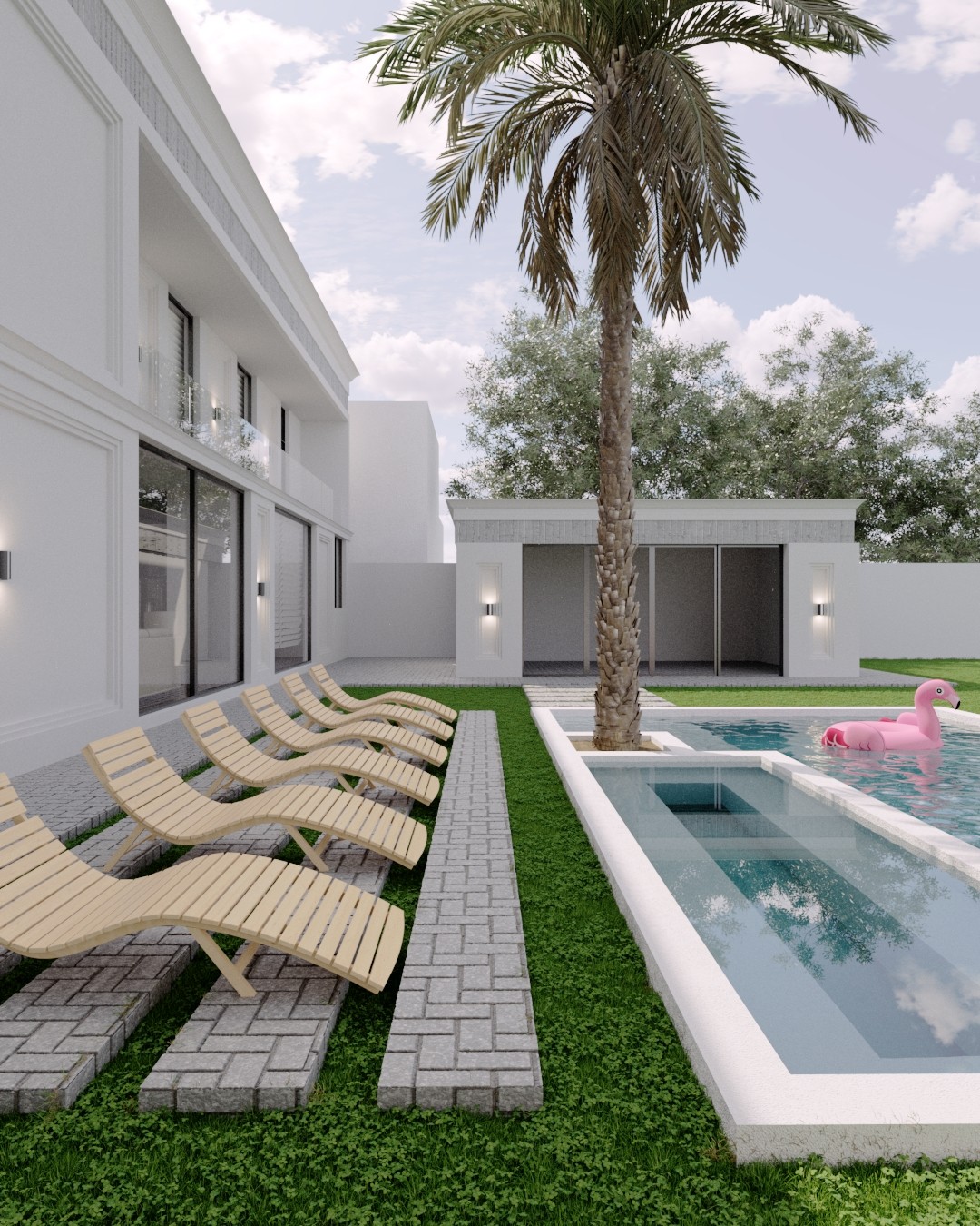 En el área exterior, la alberca se convierte en el centro de convivencia y descanso, acompañada por una zona para fiestas o reuniones, una bodega de apoyo y un cuarto de máquinas, todo discretamente integrado al diseño.