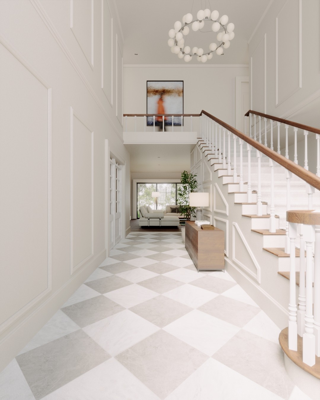 La entrada principal da la bienvenida con un vestíbulo a doble altura, donde la luz natural y una imponente escalera central marcan el carácter del hogar. Desde ahí, los espacios fluyen con armonía y claridad.